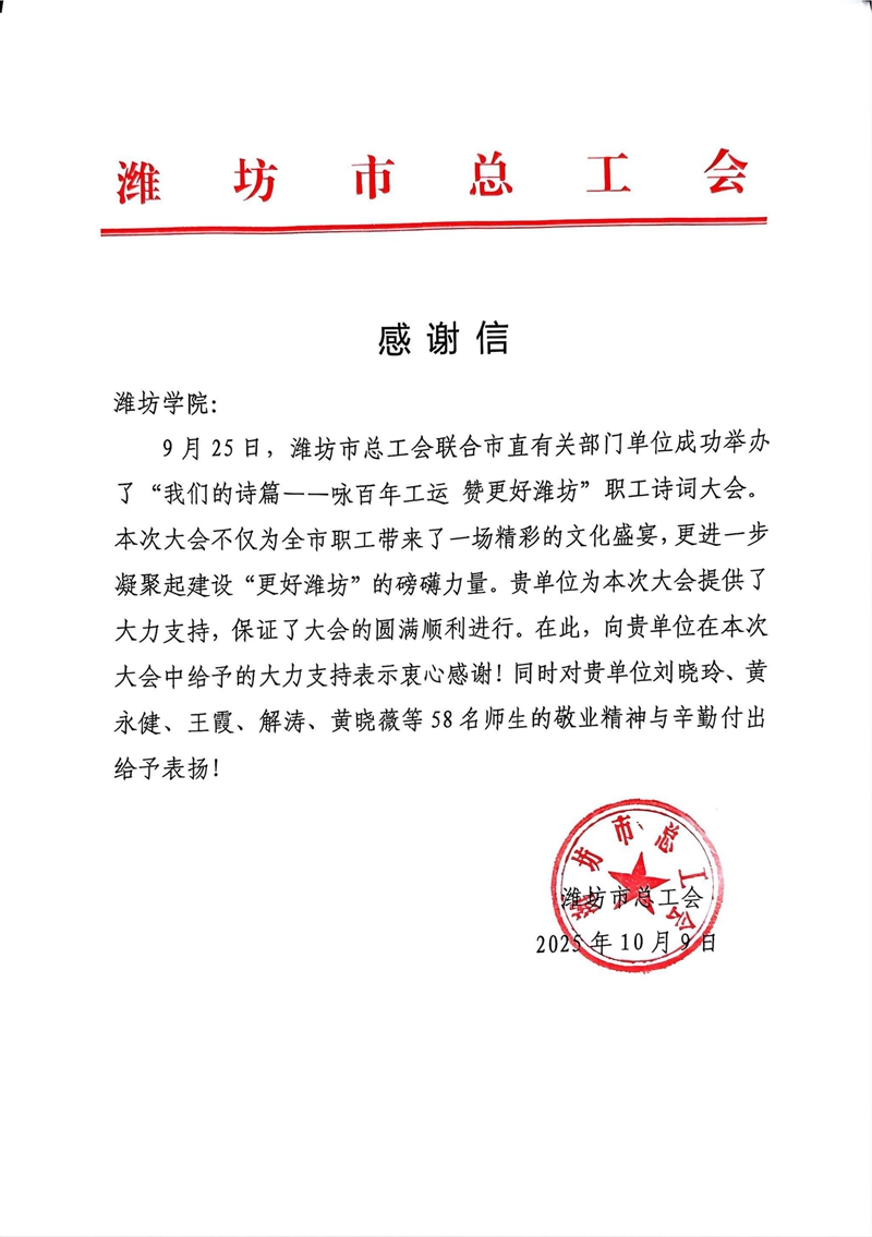 10月9日,我校收到潍坊市总工会的感谢信,信中感谢我校对“我们的诗篇——咏百年工运赞更好潍坊”职工诗词大会的大力支持。