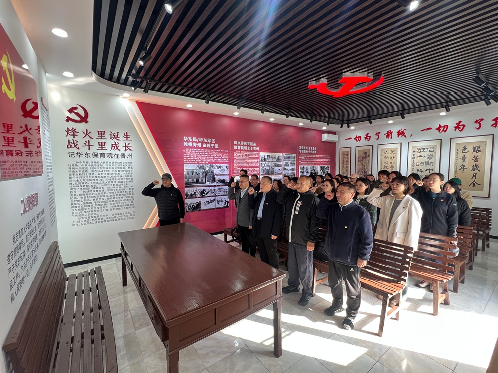 华东保育院于1948年4月在青州大官营村创办,是解放战争时期中共中央华东局为妥善安置并培育随军干部子女和烈士遗孤而设立,如今已成为重要的党性教育示范基地。参观期间,党员们认真聆听讲解员讲述那段烽火岁月中保育院的历史,通过馆内陈列的历史文献、图片、书画、实物等珍贵资料,追忆革命先烈们的英雄事迹,深刻感受了老一辈革命先烈们的崇高革命理想情怀。在这里,党员们重温了入党誓词,铿锵有力的誓言回荡在场馆内,进一步坚定了大家的理想信念。