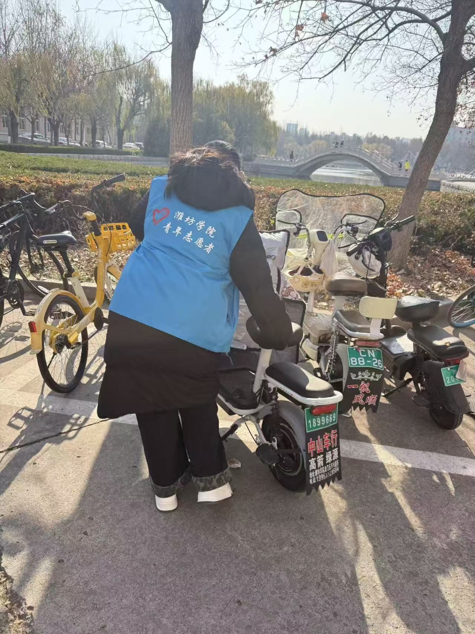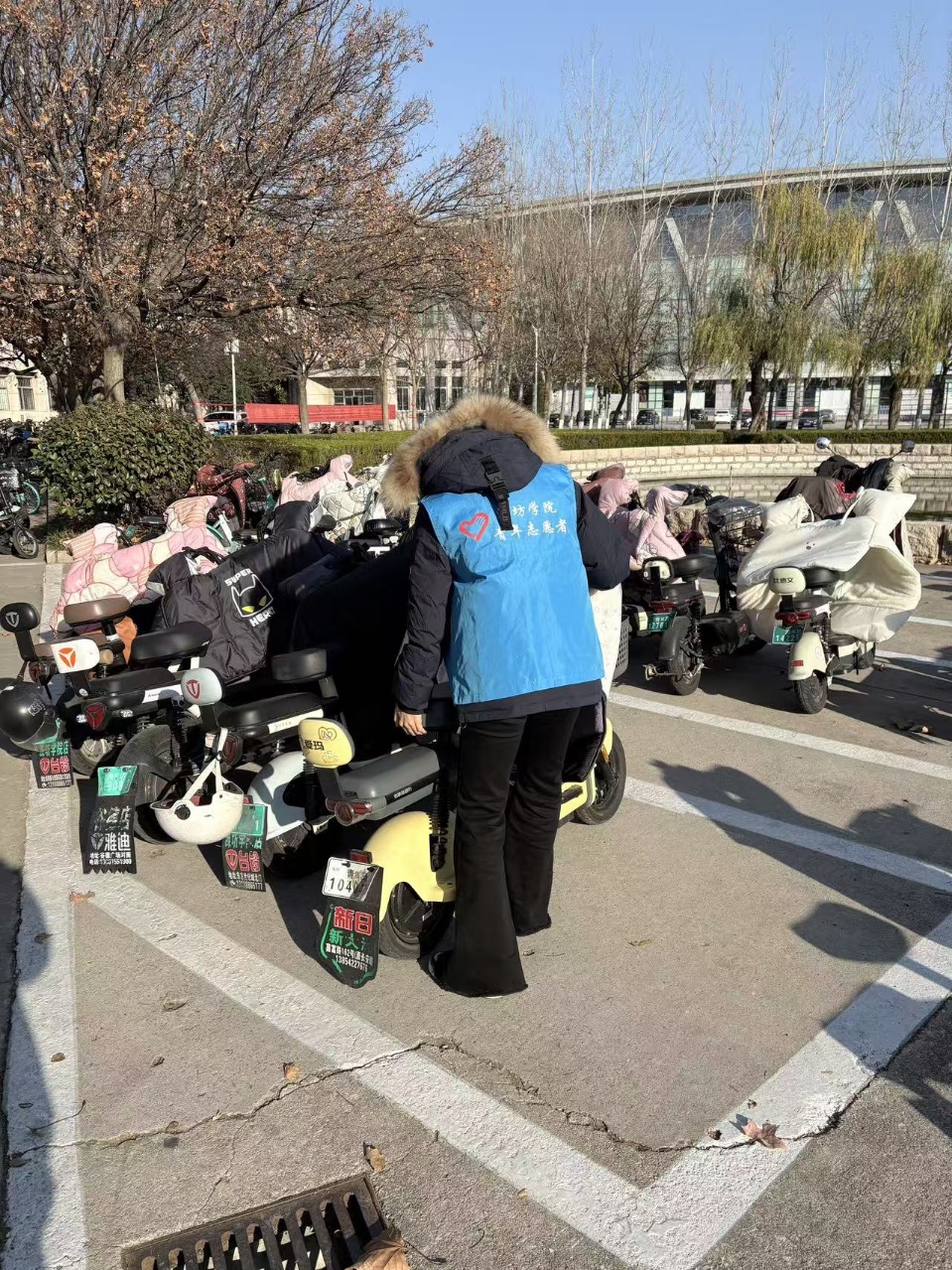 活动中,志愿者们针对音体楼前车辆无序停放、占道拥堵等问题,对区域内车辆进行集中规整,将压线、倾斜的电动车、自行车逐一扶正归位,引导车辆按标线区域有序停放,让原本杂乱的停车区恢复整洁秩序。这一行动既畅通了音体楼周边通行动线,也为师生课程往返营造了更便利的环境。