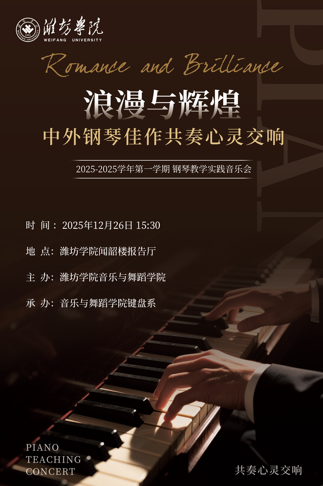 亲爱的老师同学们,2025—2026学年第一学期钢琴教学实践音乐会“浪漫与辉煌:中外钢琴佳作共奏心灵交响” ,将于12月26日15:30分在闻韶楼排练厅举行,键盘系师生诚邀您一同感受中外钢琴佳作的独特魅力。