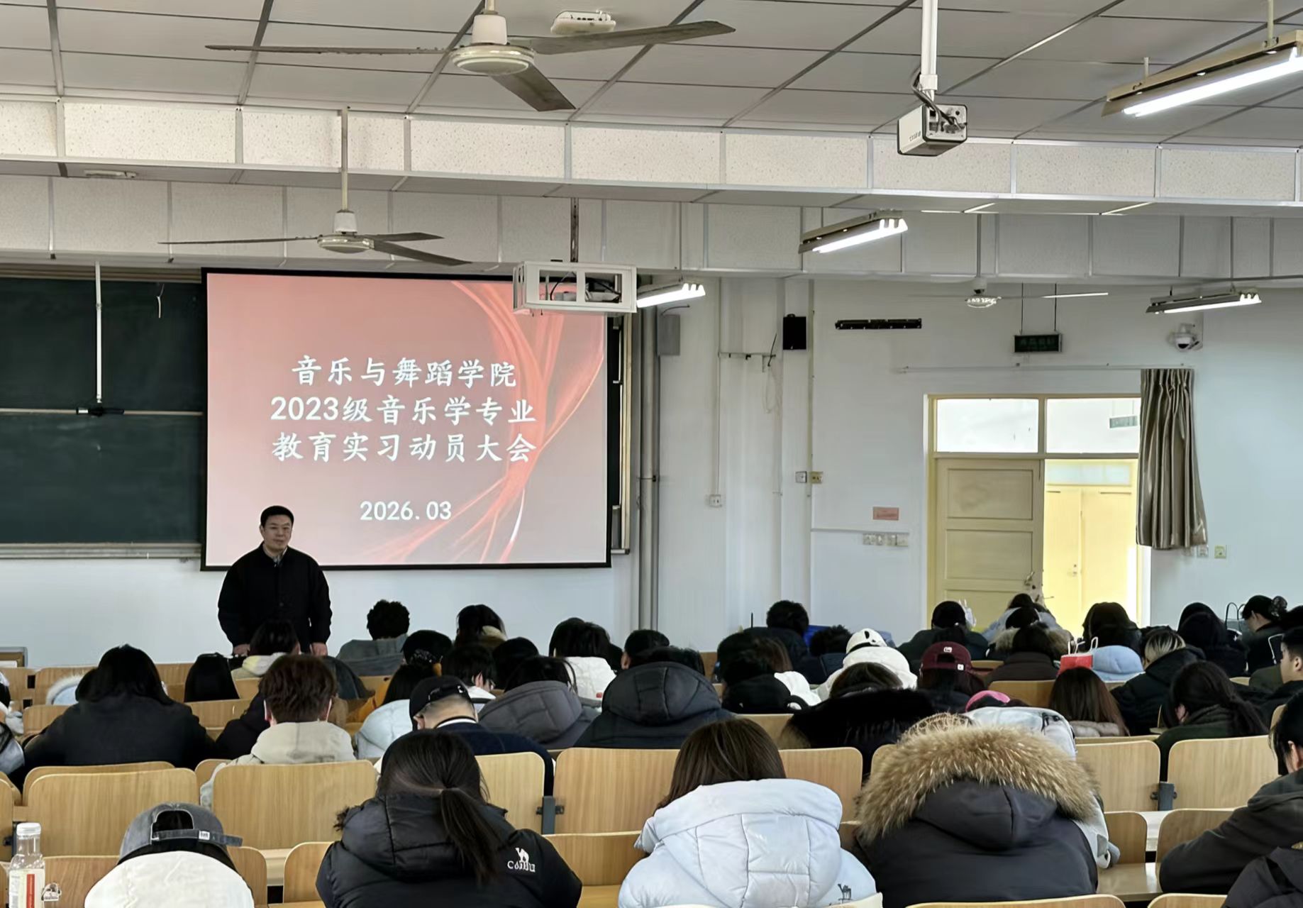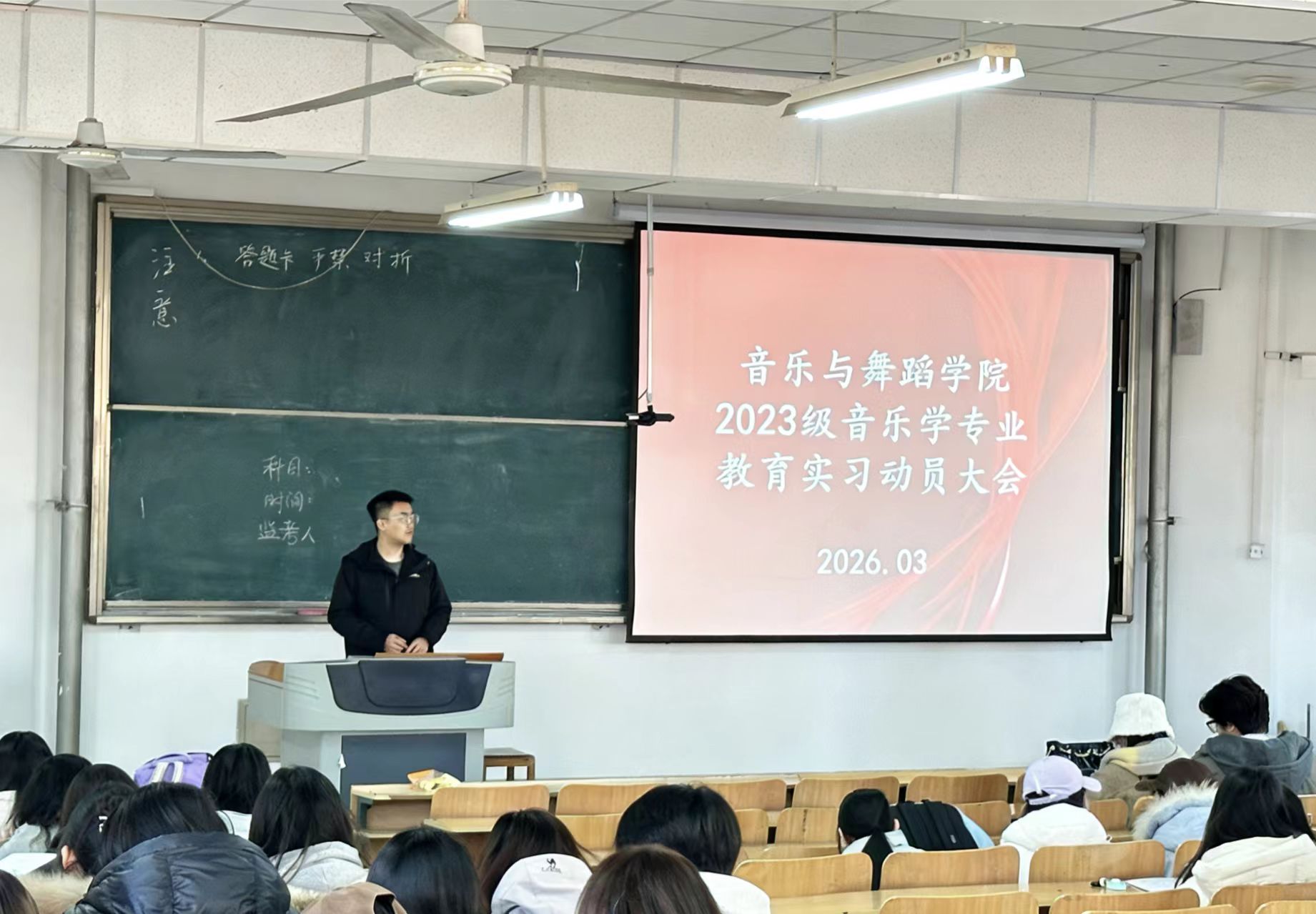 为进一步加强师范生实践教学环节,夯实教育教学基本功,切实提升人才培养质量,3月10日,音乐与舞蹈学院在8431召开2023级教育实习动员大会。学院院长王雷出席会议并讲话,大会由2023级辅导员李广鑫主持,2023级音乐学(师范类)全体学生参加。